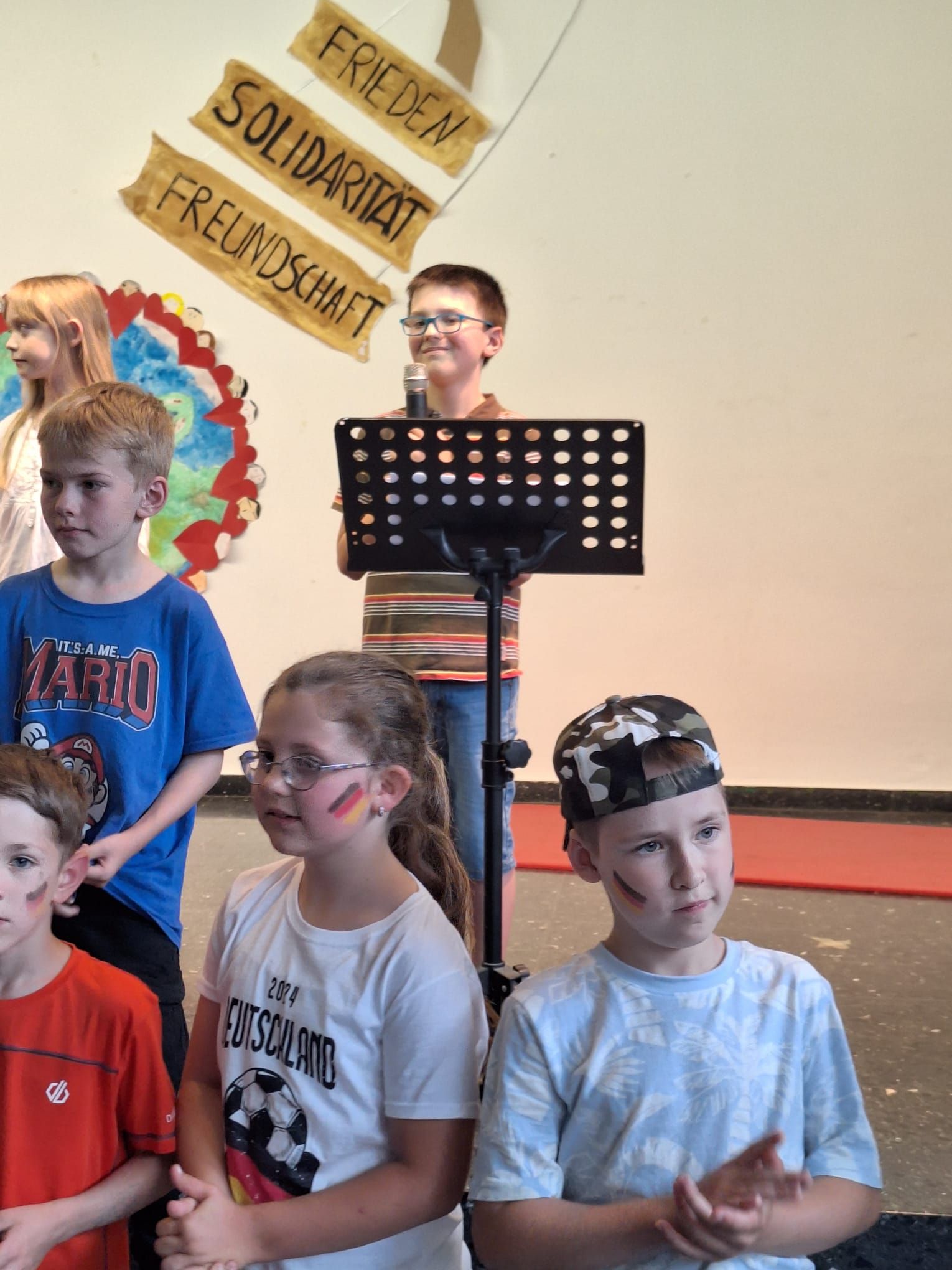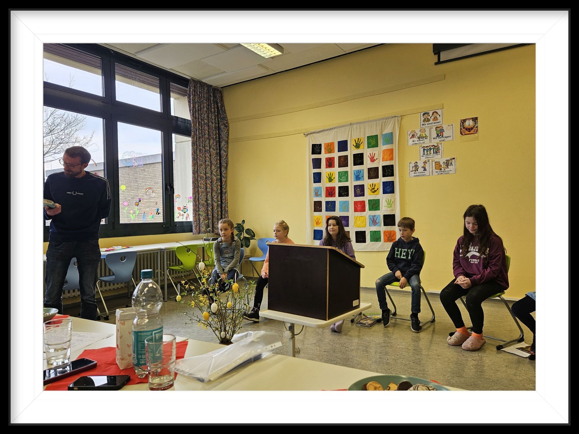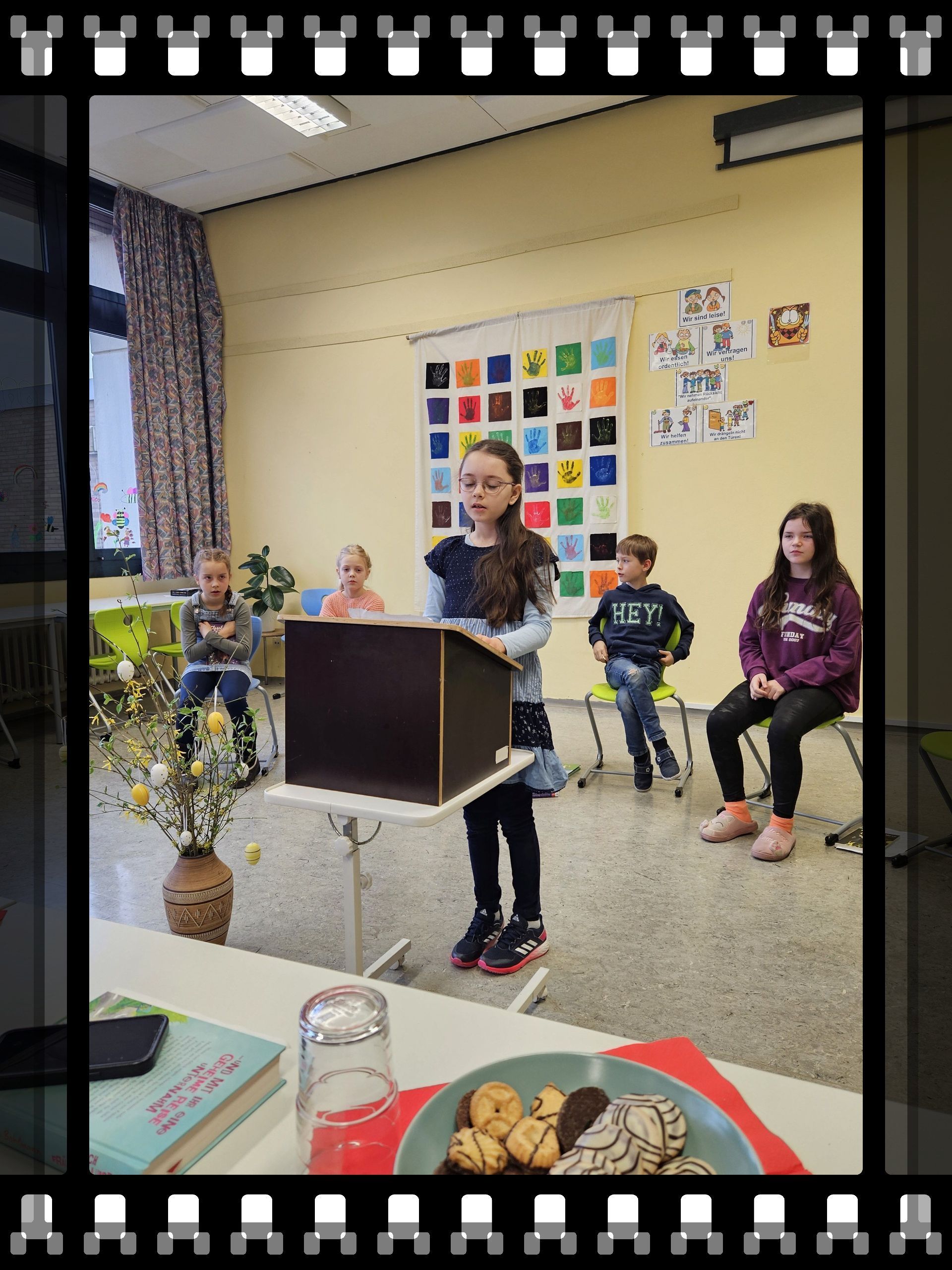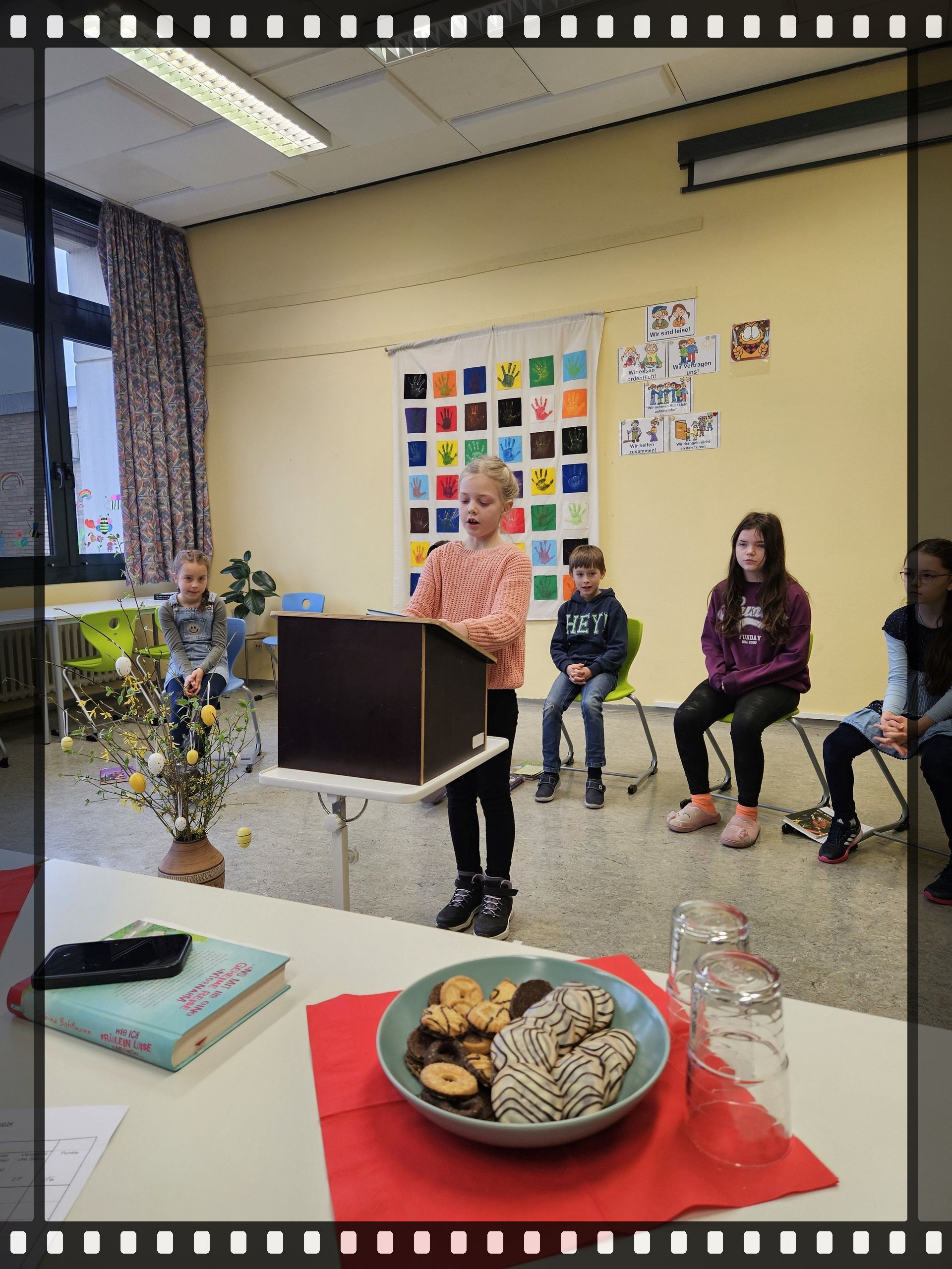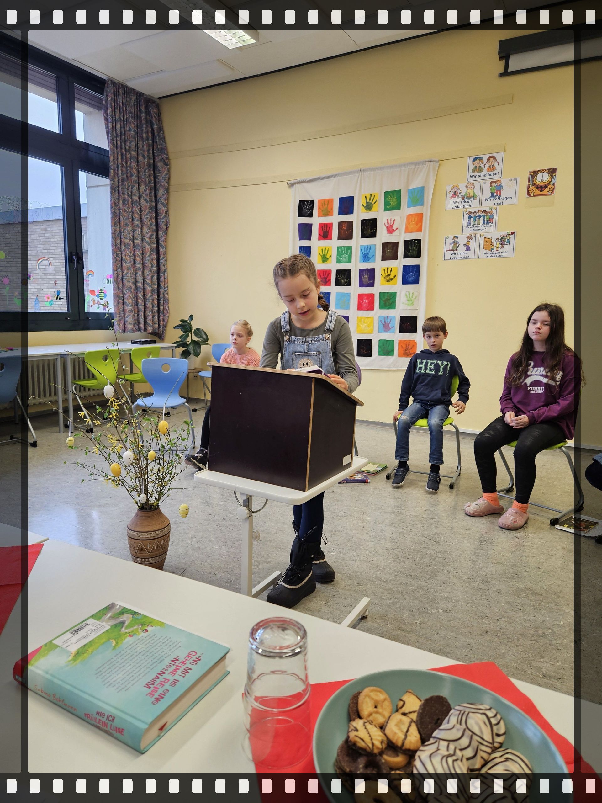 Mit Plakat, Buch und Notizen zum Autor, dem Verlag, Erscheinungsjahr, Vorstellung der Hauptfiguren und einer kurzen Inhaltsangabe erschienen am 6. März 2024 die Gewinnerinnen und Gewinner der Klassen 3 und 4 zum jährlichen Vorlesewettbewerb der Grundschule Walkenried. Alle Teilnehmenden überzeugten mit einer spannenden Hinführung und ihrem vorbereiteten Textauszug aus ihrer Buchpräsentation. Auch das durch Herrn Rose vom Buchhaus Thalia aus Nordhausen ausgesuchtem Buch für das Vorlesen eines unbekannten Textes, meisterten die begeisterten LeserInnen mit Bravour. Die Betonung der wörtlichen Rede und das Vorlesen mit verstellten Stimmen gelang den Teilnehmenden so gut, dass Herr Rose, der von vielen verschiedenen Schulen als Jurymitglied eingeladen wird, beeindruckt die Lesekompetenz der besten VorleserInnen der Grundschule Walkenried lobte. Herzlichen Glückwunsch an alle Teilnehmenden und weiterhin viel Spaß beim Lesen mit den vom Buchhaus Thalia gestifteten Buchpreisen!